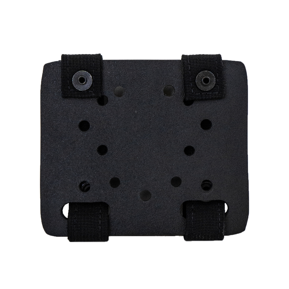 The small MOLLE Adapter Plate is used to attach holsters and pouches to MOLLE looped vests. Using Allen screws and the mounting holes in the plate, user can attach one holster in vertical or angled position, or two accessory pouches affixed side by side. Constructed of a sturdy polymer, it has two pieces of 1 inch webbing on each side of the plate that weave through and snap around the MOLLE loops for secure attachment of gear.